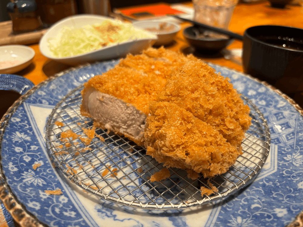 A thick cylindrical cut of hire katsu (ヒレカツ, Tenderloin Katsu) that has a nice thickness to eat and a strong meaty umami (旨味, Savoriness) taste. The dinner portion is ¥2,150